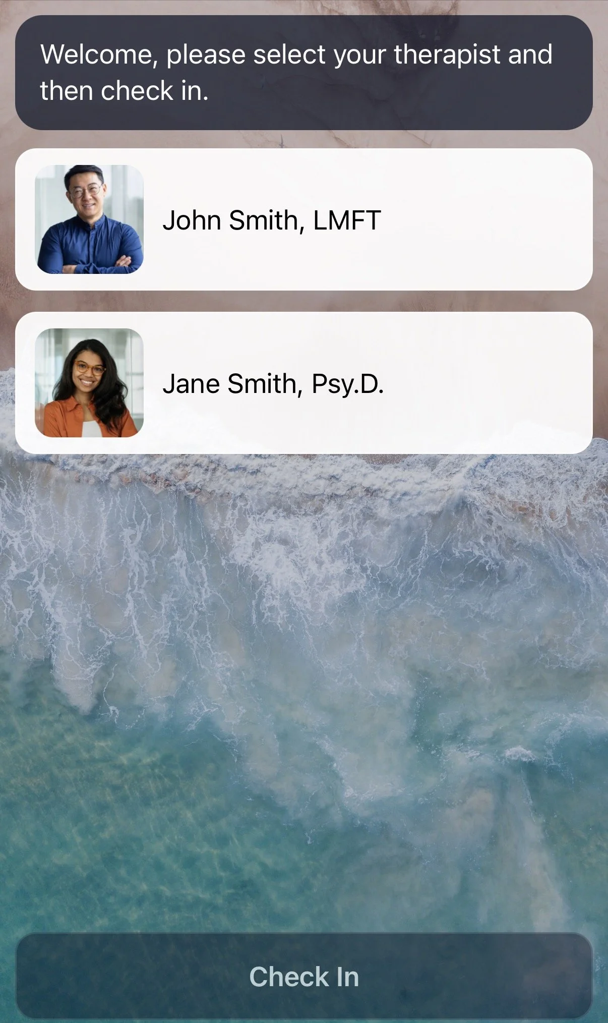 Simple check in that's HIPAA compliant- no client data is ever stored. Incredibly user friendly for anyone. Your name, photo, and title will be on display for your client to easily find you.